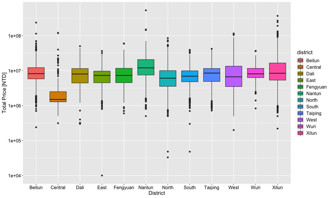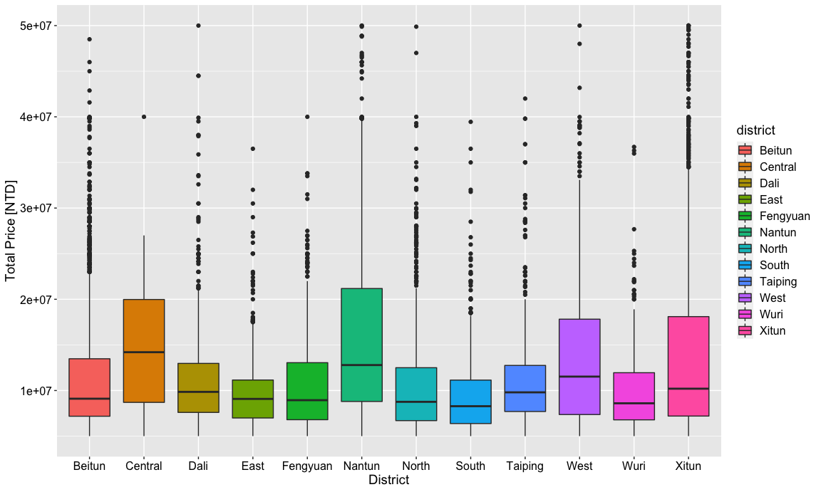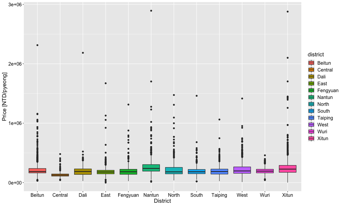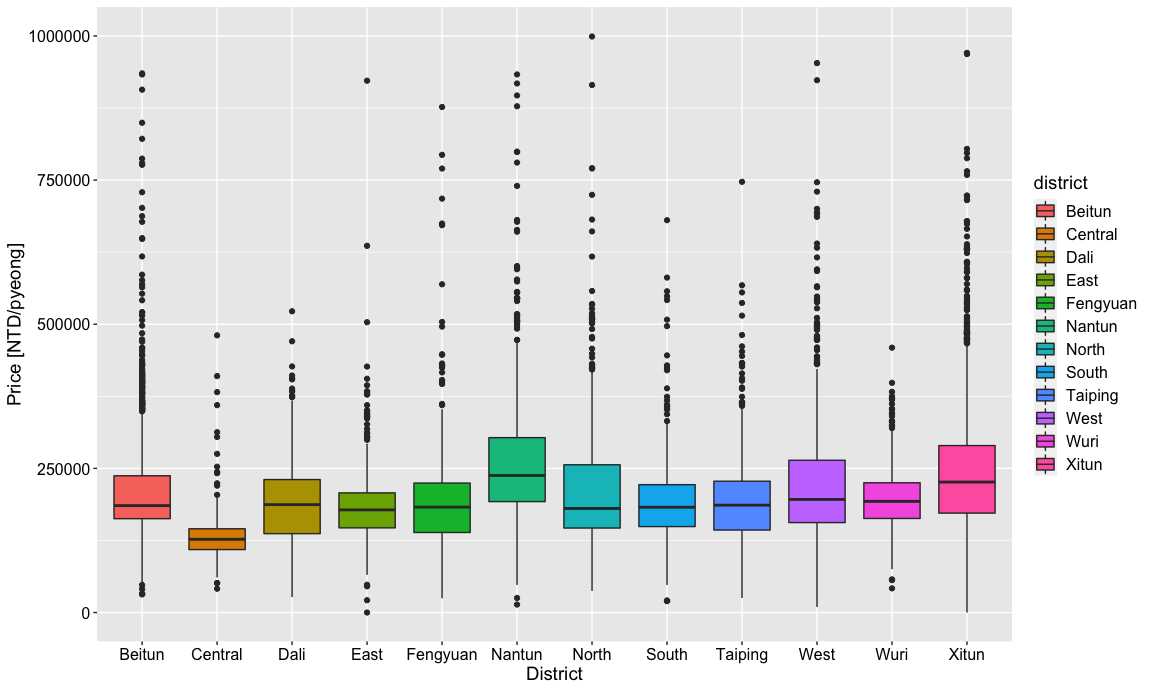 Clearly, we see that the median price of NTD/pyeong is similar, the price of Nantun district is the highest, and the Central district is the lowest. This is attributed to Nantun district is the newly developed area, but the Central district is the old urban area.