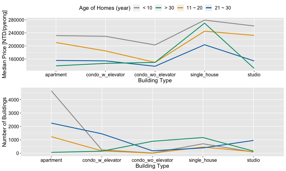 By grouping the data for different buildings, we see that the price per pyeong is the highest for single house for different ages of homes, and the different is largest for age larger than 30 years old. Moreover, For buildings over 30 years old, we find out that the number of single houses is significantly more than other type of buildings. This follows our intuition that people usually built single house in the past, but we tend to build apartments for higher land capacity nowadays. This is consistent with the much higher number of apartments for those less than 10 years old.