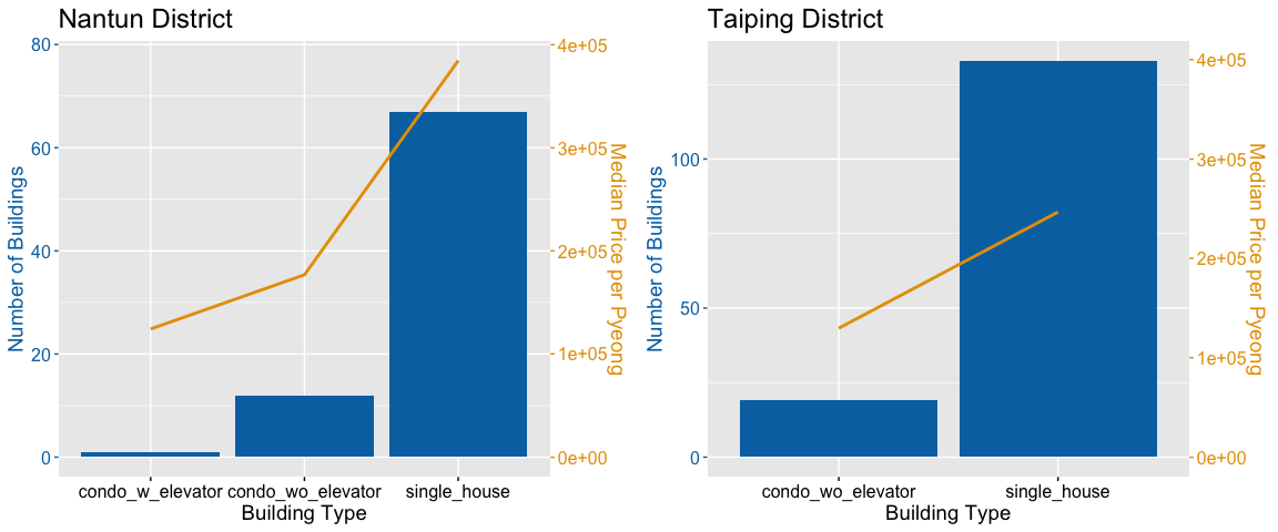 Furthermore, we would like to take Nantun and Taiping district as example to further investigate our hypothesis. In both districts, the price per pyeong for single house is much highrer than other type of