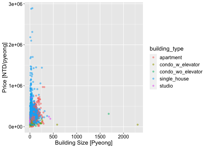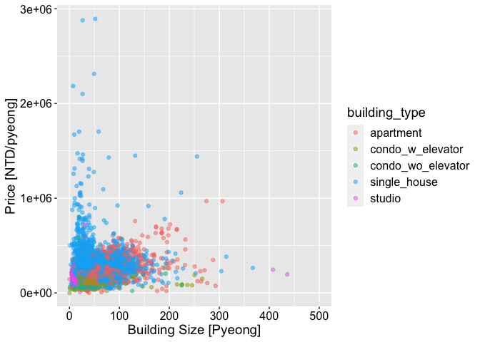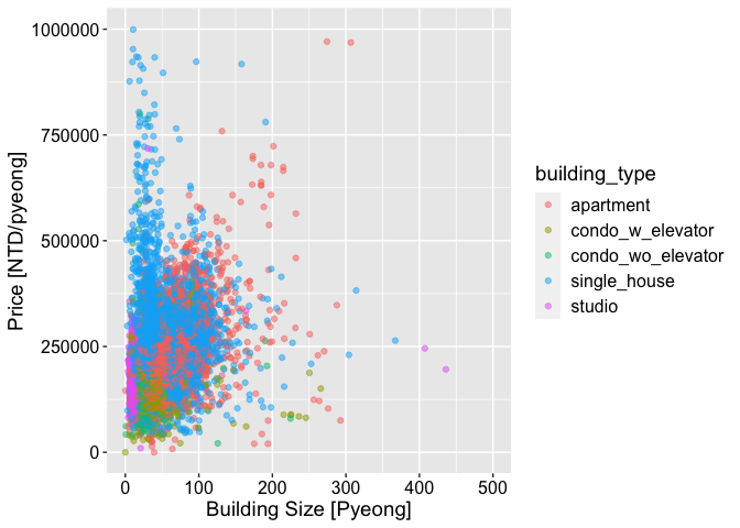 After probing the influence of age, type, and location of the building, we also want to see if there is relationship between size of the building and price. Intuitively, those luxury homes usually are much larger than typical home with better location and newly renovation. We plot the building size vs. NTD/pyeong to investigate the correlation. Here, we find out that there are three outliers that are larger than 500 pyeongs. These transaction may include whole property rather than single household. Therefore, we will exclude them.